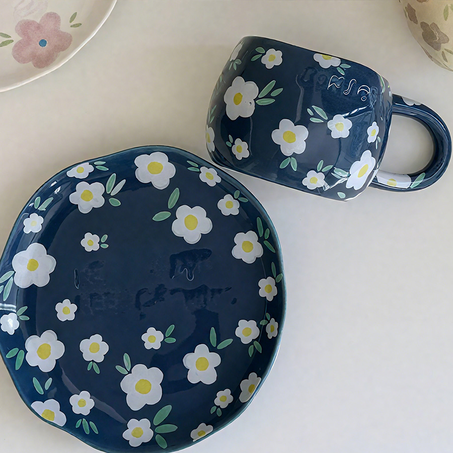 深蓝白色花【杯+碟】