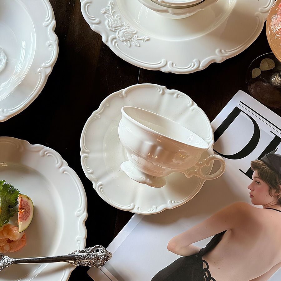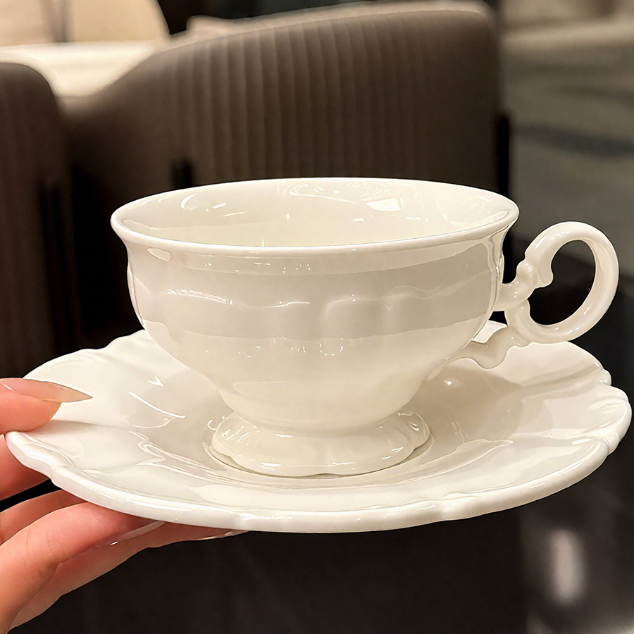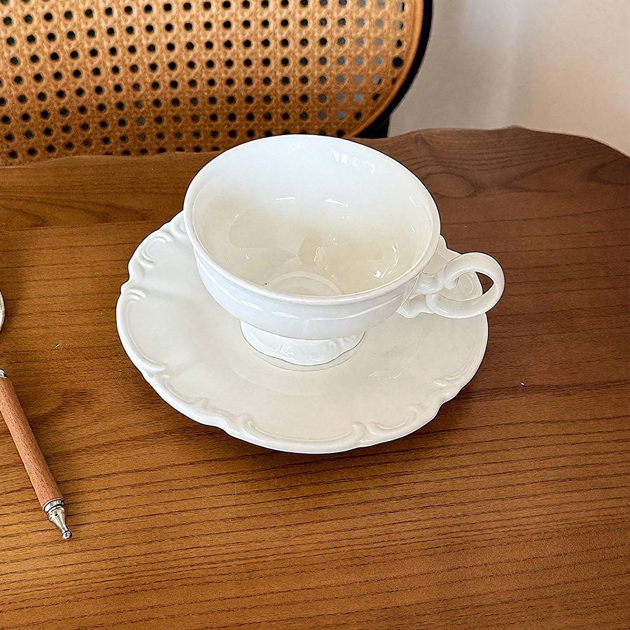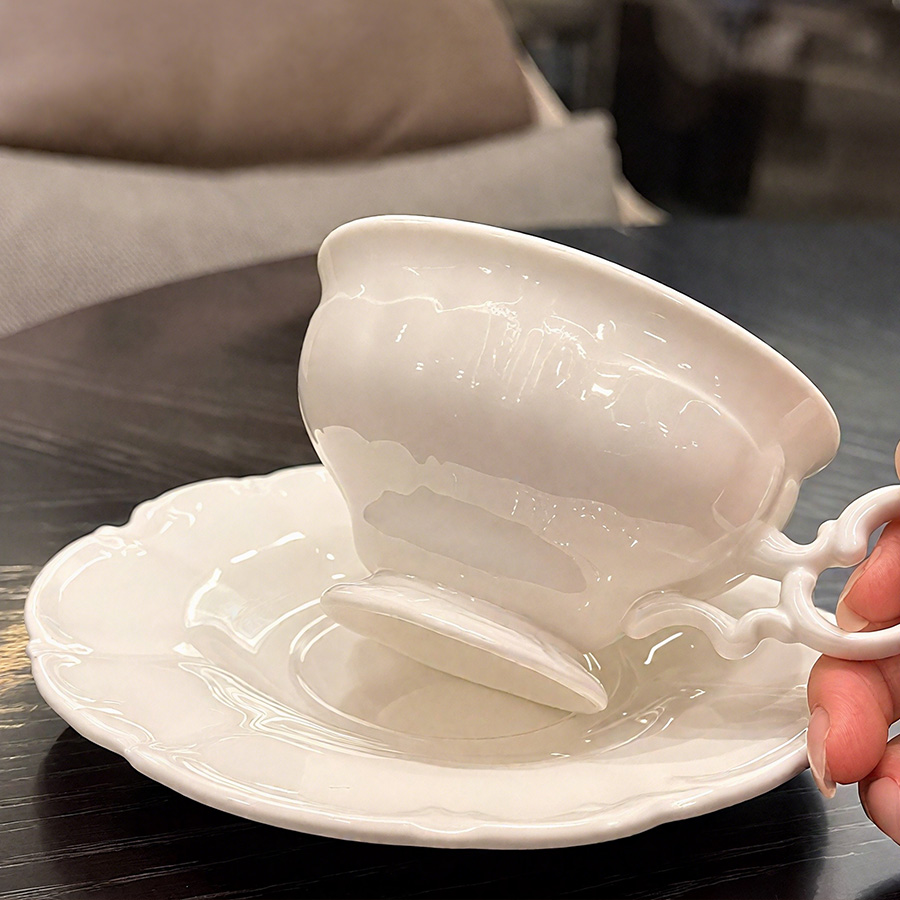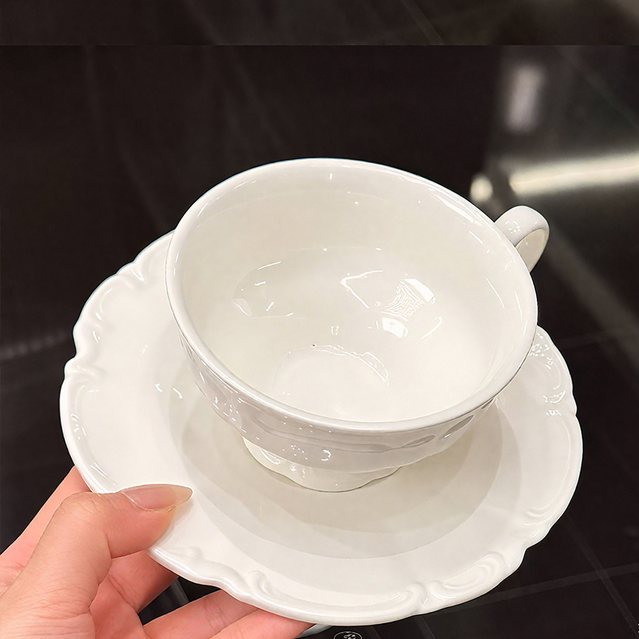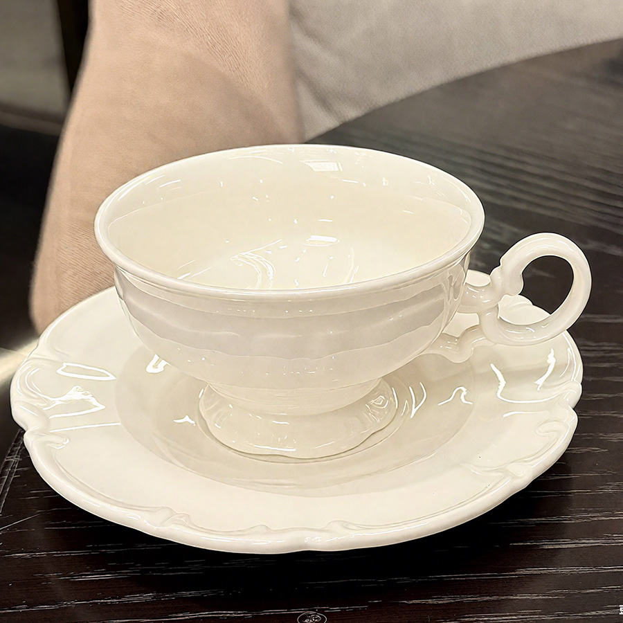 杯碟 奶白浮雕