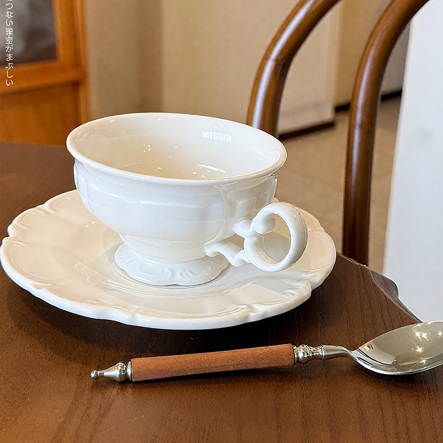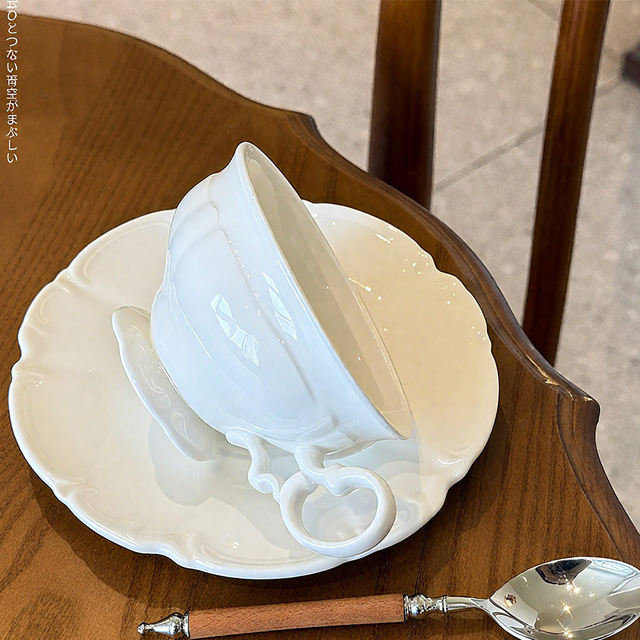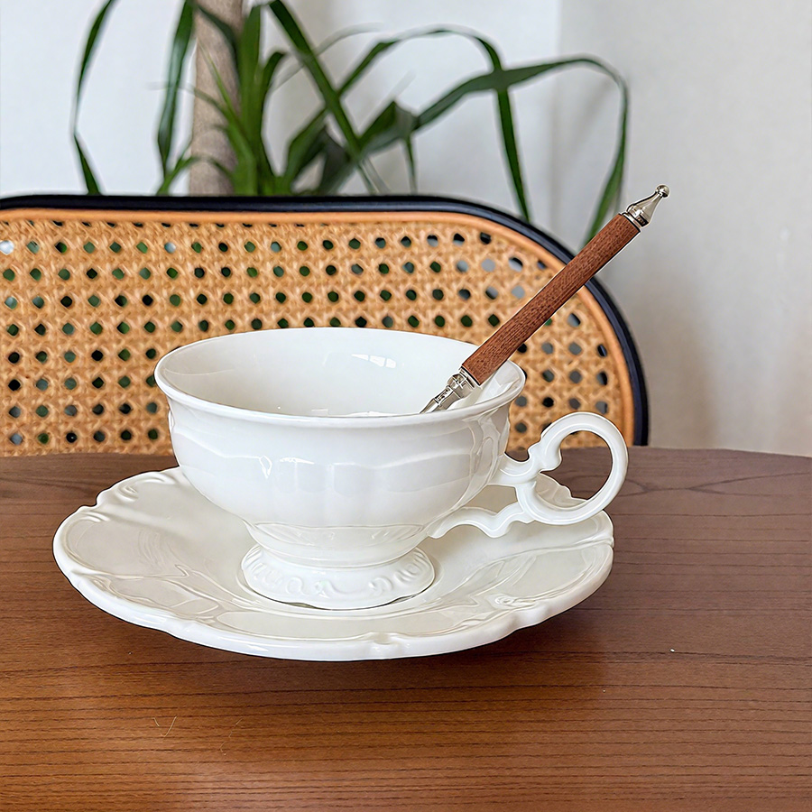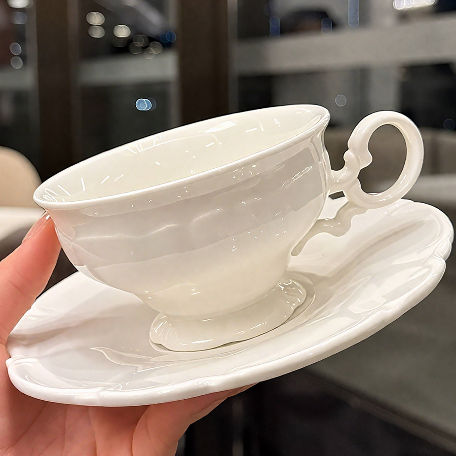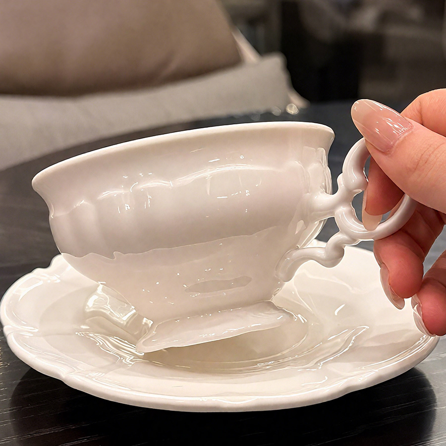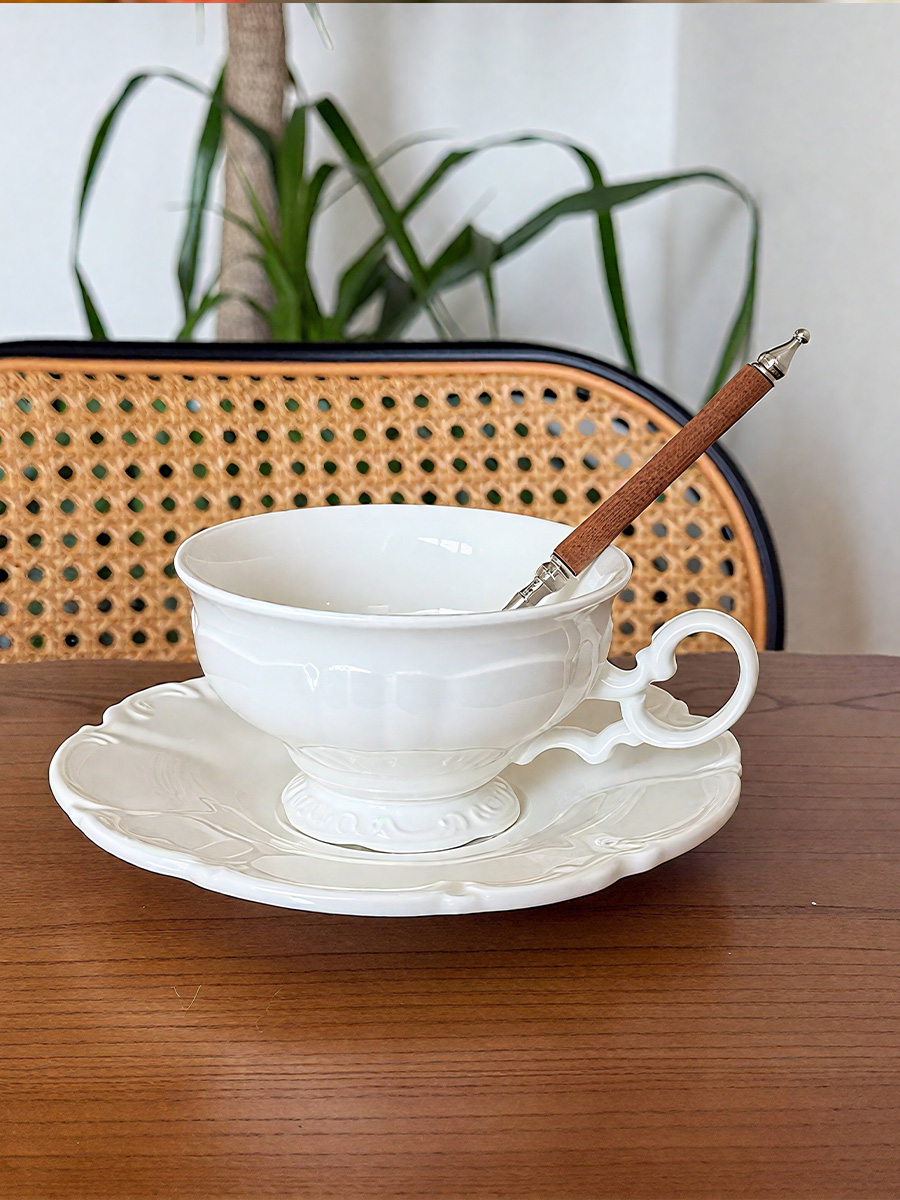 杯碟 奶白浮雕